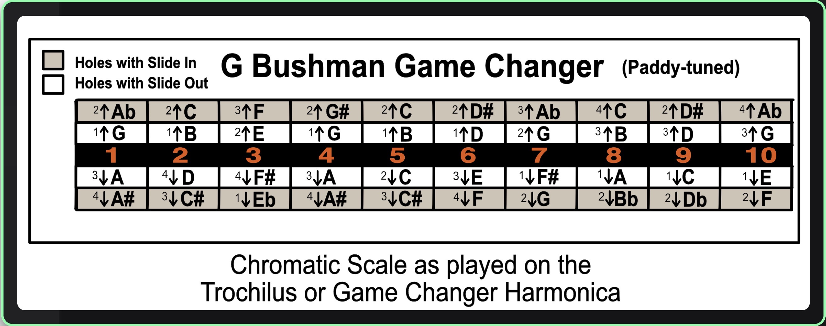 My hearing is not great so learning by ear is a long, long process for me. So I tried to ease and shorten that with this diagram. Since it is possible to play the chromatic scale with this paddy-tuned harp I hoped to make it less painful to use a lead sheet to get the notes and timing as well as to see in which holes they exist and whether to blow or draw while pressing or releasing the slider. The numbers beside each note name assume you are playing the chromatic scale and suggest the order of playing the notes in that hole. If anyone finds this useful you are welcome to incorporate it into your acquisition of new songs… If you think of any improvements I am open to revising it..